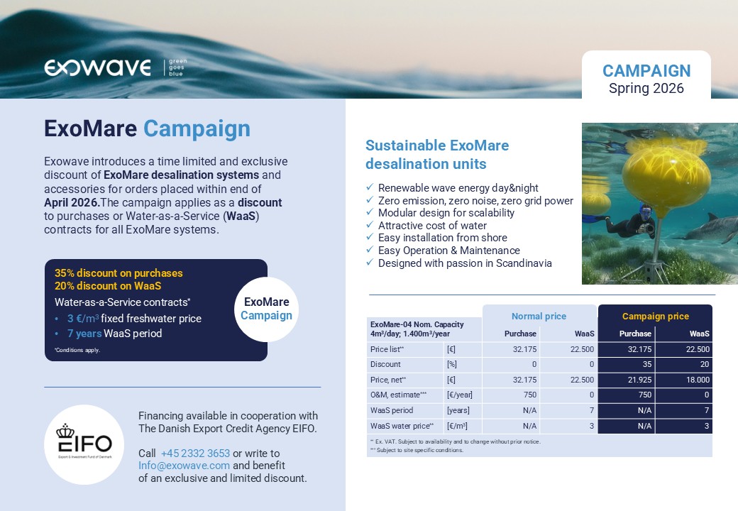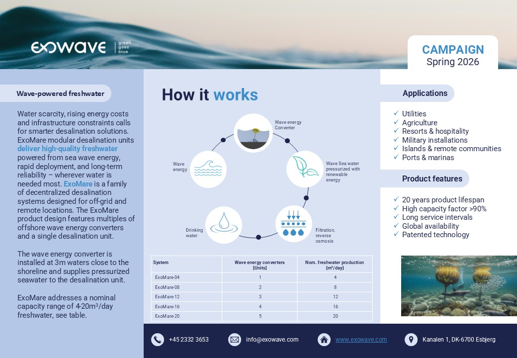 At Exowave, we are excited to to announce the first commercial product range of desalination systems powered from renewable wave energy. Committed to contribute to the combat on global water crisis, Exowave now manufactures the patented ExoMare desalination units addressing the low capacity market segment 4 - 20m3/day freshwater.